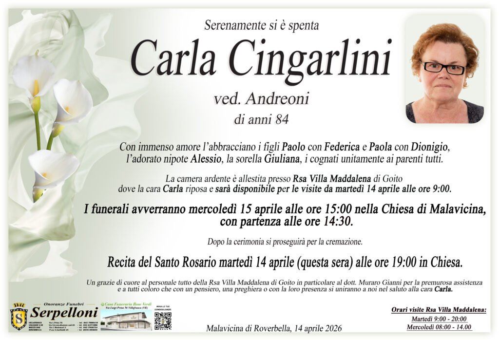 Carla Cingarlini I FUNERALI AVVERRANNO MERCOLEDì 15 APRILE ALLE ORE 15:00NELLA CHIESA DI MALAVICINA Compila il form per esprimere la tua vicinanza ai suoi cari Name *CellulareEmail *Messaggio *0 / 500Privacy *Ho preso attenta visione dell’ informativa privacy e acconsento al trattamento dei miei dati personali, secondo le modalità e i termini specificati all’interno nella stessa. Invia CONDIVIDI LA NOTIZIA