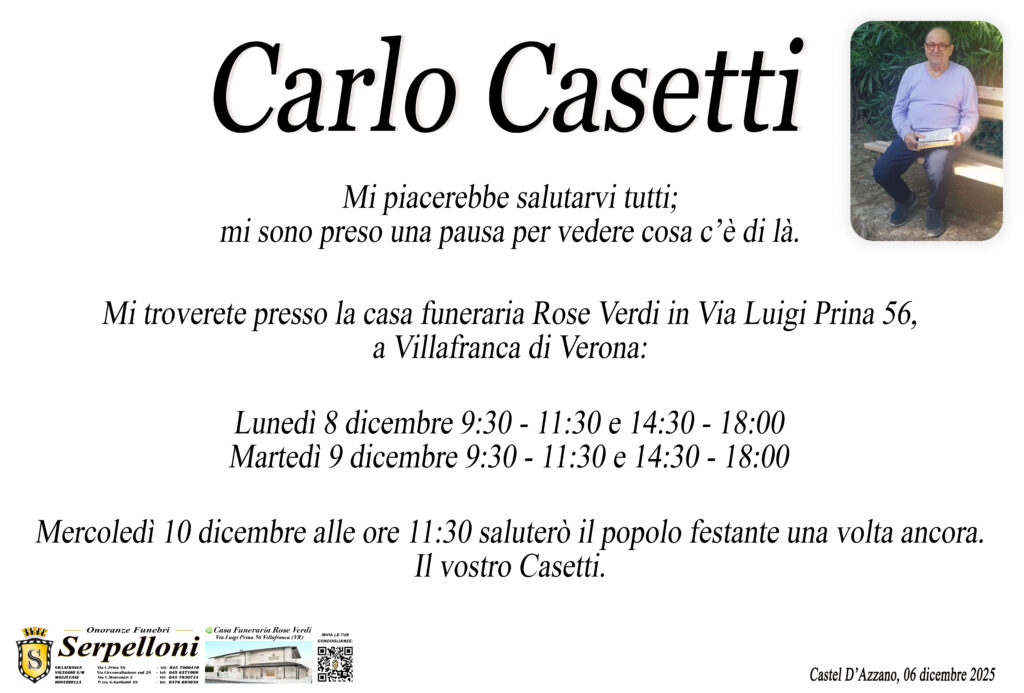Carlo Casetti un saluto civile avverrà mercoledì 10 DICEMBRE ALLE ORE 11:30in casa funeraria rose verdi Compila il form per esprimere la tua vicinanza ai suoi cari Name *CellulareEmail *Messaggio *0 / 500Privacy *Ho preso attenta visione dell’ informativa privacy e acconsento al trattamento dei miei dati personali, secondo le modalità e i termini specificati all’interno nella stessa. Invia CONDIVIDI LA NOTIZIA