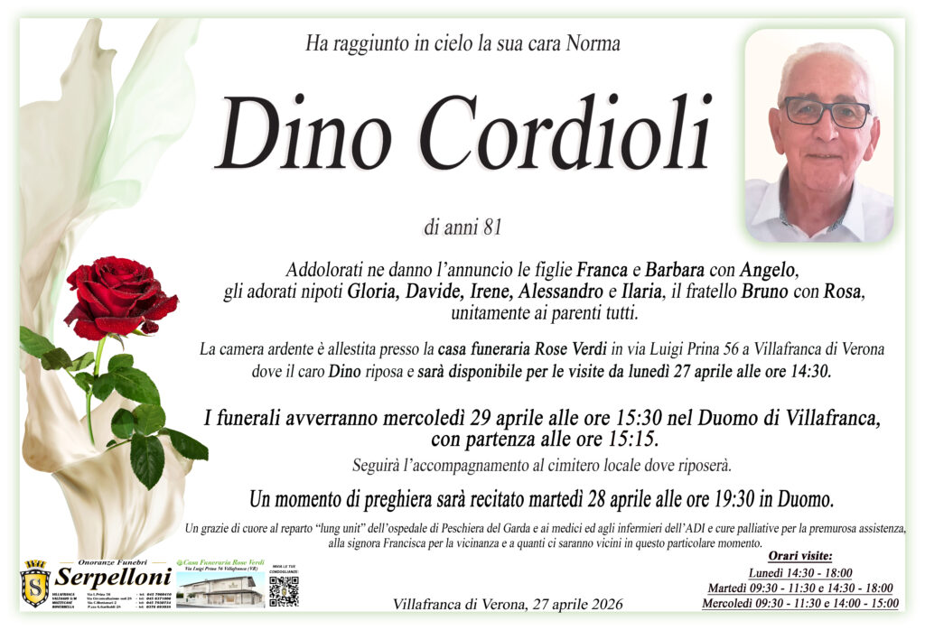 Dino Cordioli I FUNERALI AVVERRANNO MERCOLEDì 29 APRILE ALLE ORE 15:30NEL DUOMO DI VILLAFRANCA Compila il form per esprimere la tua vicinanza ai suoi cari Name *CellulareEmail *Messaggio *0 / 500Privacy *Ho preso attenta visione dell’ informativa privacy e acconsento al trattamento dei miei dati personali, secondo le modalità e i termini specificati all’interno nella stessa. Invia CONDIVIDI LA NOTIZIA