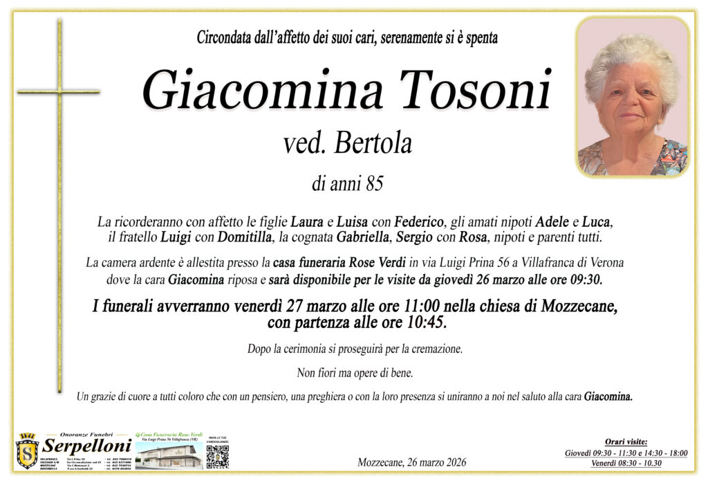 Giacomina Tosoni I FUNERALI AVVERRANNO VENERDì 27 MARZO ALLE ORE 11:00NELLA CHIESA DI MOZZECANE Compila il form per esprimere la tua vicinanza ai suoi cari Name *CellulareEmail *Messaggio *0 / 500Privacy *Ho preso attenta visione dell’ informativa privacy e acconsento al trattamento dei miei dati personali, secondo le modalità e i termini specificati all’interno nella stessa. Invia CONDIVIDI LA NOTIZIA