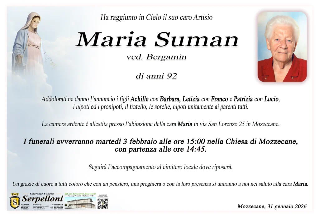 Maria Suman I FUNERALI AVVERRANNO MARTEDì 3 FEBBRAIO 2026 ALLE Ore 15:00 NELLA CHIESA DI MOZZECANE Compila il form per esprimere la tua vicinanza ai suoi cari Name *CellulareEmail *Messaggio *0 / 500Privacy *Ho preso attenta visione dell’ informativa privacy e acconsento al trattamento dei miei dati personali, secondo le modalità e i termini specificati all’interno nella stessa. Invia CONDIVIDI LA NOTIZIA