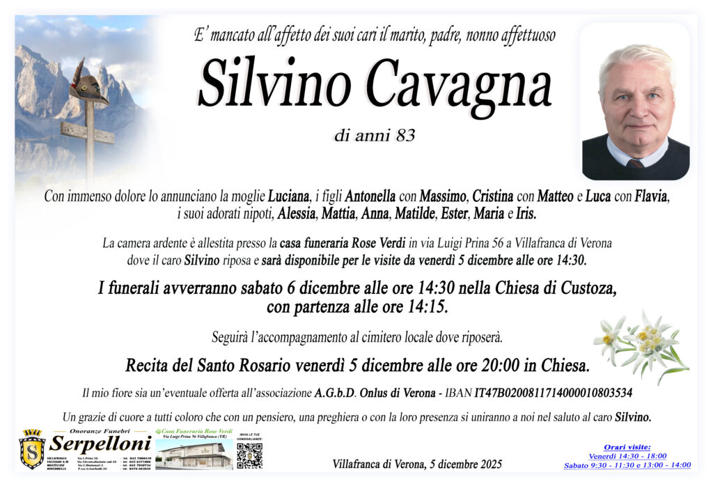 Silvino Cavagna I funerali avverranno sabato 6 DICEMBRE ALLE ORE 14:30nella chiesa di Custoza Compila il form per esprimere la tua vicinanza ai suoi cari Name *CellulareEmail *Messaggio *0 / 500Privacy *Ho preso attenta visione dell’ informativa privacy e acconsento al trattamento dei miei dati personali, secondo le modalità e i termini specificati all’interno nella stessa. Invia CONDIVIDI LA NOTIZIA